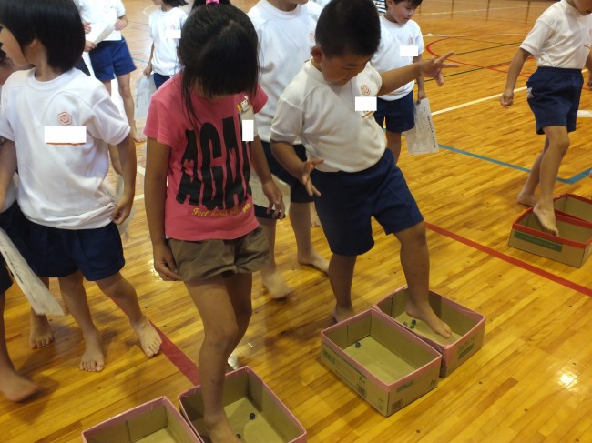 4つめは「足の指でつかもう」で「箱に入ったビー玉を足の指でつまみ、別の箱に移す」ものです。1人がやると、元気委員会の子が消毒をしていました。