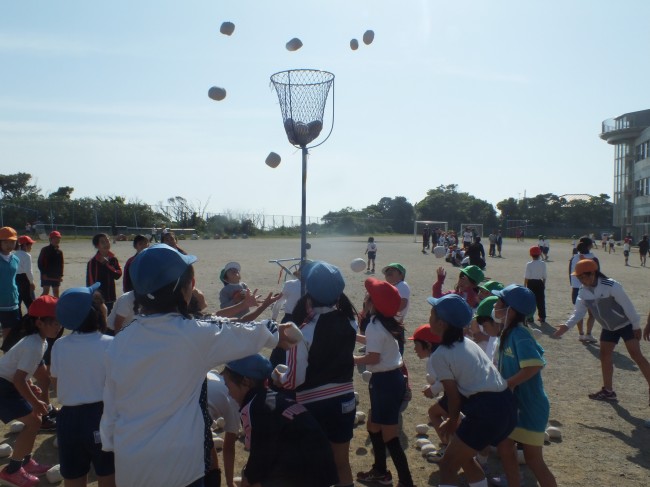 つな・玉・リレーの練習 2015/05/18 14日の朝、運動場に出ると、綱引き・玉入れ・リレーの練習が始まっていました。時刻は7時45分過ぎ。自主的にこれだけ多くの子が参加して練習できるのも御前崎小のよさです。綱引きの子は、綱を引く前に当然綱を出さないといけません。玉入れも同じです。こういう準備も、先生方でなく子どもたちが進んでやっています。