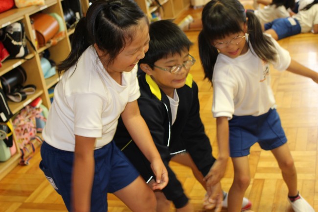 28日(火)、この日も雨なので、サンサンタイムは校舎内で過ごしました。赤組は、ほかほか遊びでした。