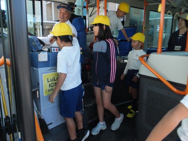 バスの乗り方教室 2年生 2019/10/17 10月10日(木)に2年生が生活科の学習で「バスの乗り方教室」を行いました。 御前崎小の校地内で実際に静鉄ジャストラインのバスを使っての乗り方教室です。初めて路線バスに乗る児童もあり、どの子も興味津々。運転手さんの話を真剣に聞いていました。 最後には、運転席にも座らせてもらい、とても楽しく学習ができました。 本番は、10月下旬に実施予定の校外学習『アスパル見学』。市立図書館アスパルまで路線バスで出かけます。