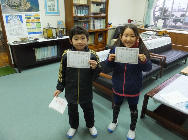 九九マスター(2年生) 2015/02/05 2年生が「九九マスターになろう!」を目標に掲げ、暗記ですらすら言えることに挑戦しています。最後の仕上げは、校長室で校長先生に聞いてもらうことです。昨日1名、今朝2名の子が挑戦しました。3名とも見事合格で、九九マスターの賞状を校長先生からいただきました。校長室が2年生でいっぱいになるといいですね。