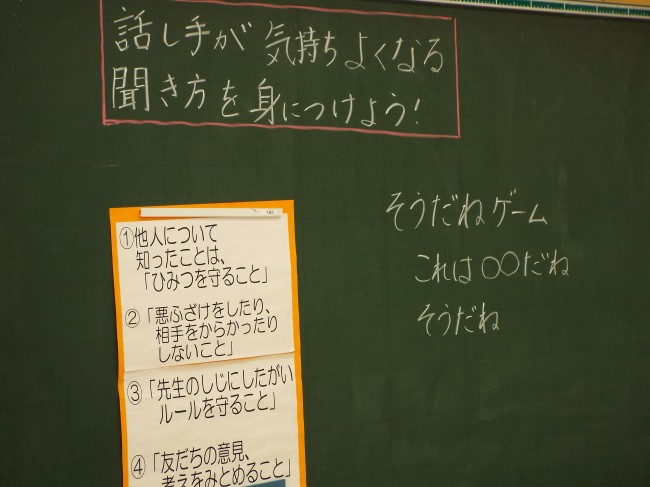 人間関係プログラム 4年1組 2016/05/11 10日(火)の4時間目、4年1組では、人間関係づくりプログラムの授業を行いました。この日の授業の目当ては「話し手が気持ちよくなる聴き方をしよう」です。