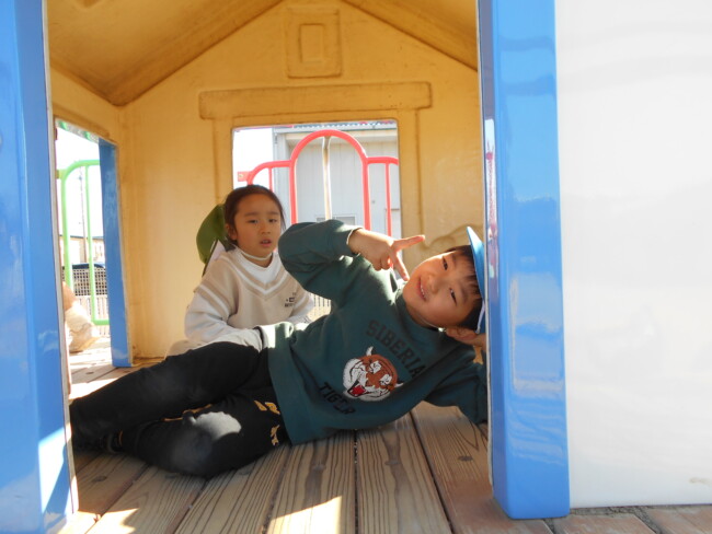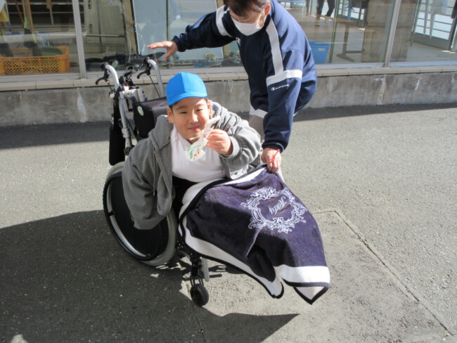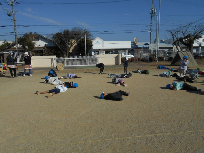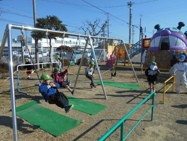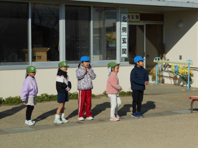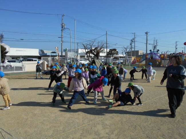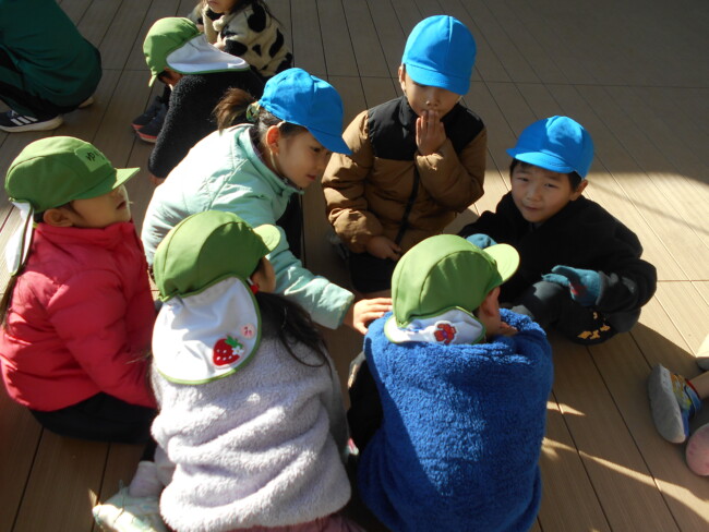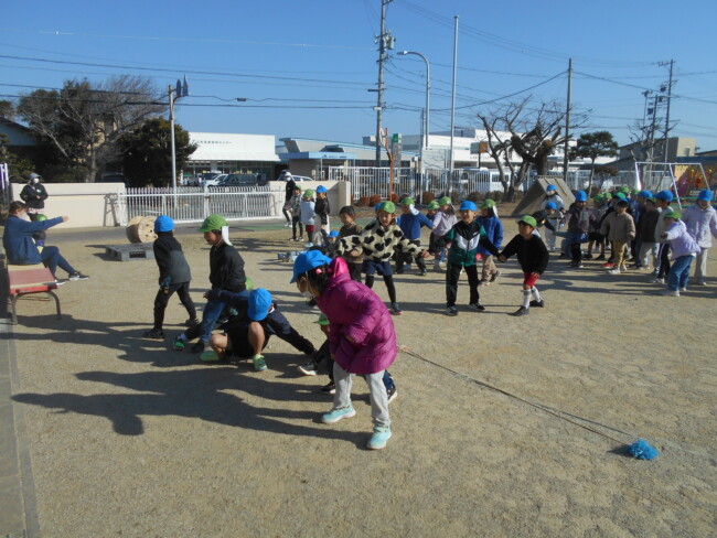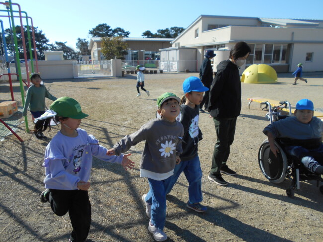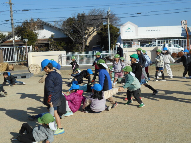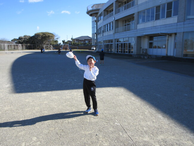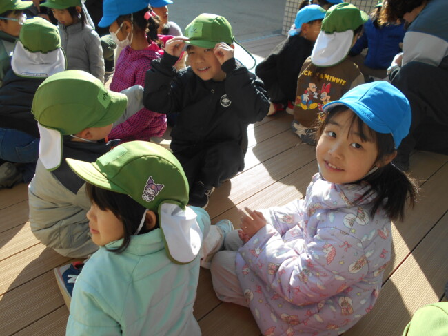 1年生は、白羽のんのん英育園の年長さんと風を使った冬の遊びを楽しもうと、出かけました。あいにくこの日は無風で、準備した手作りおもちゃが使えなかったので、かわりに園庭で一緒に遊ばせてもらいました。作った凧や風車で遊べなかったのは残念でしたが、もうすぐ毎日学校で遊べますね。楽しみにしています。
