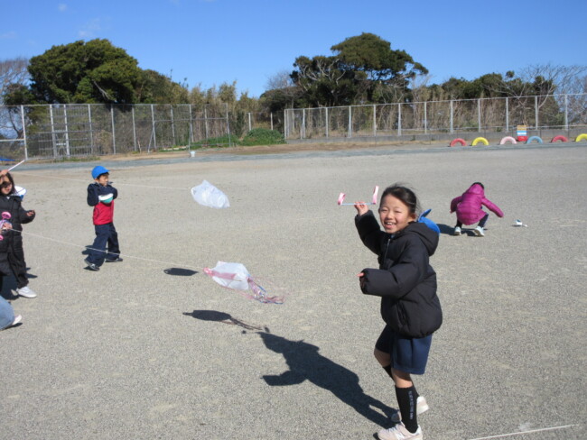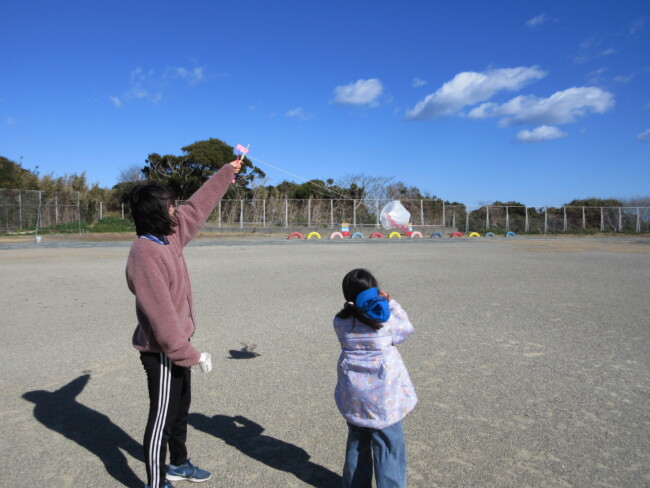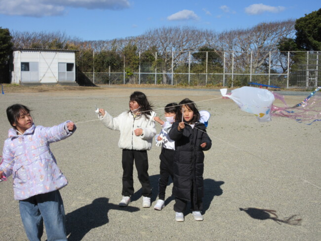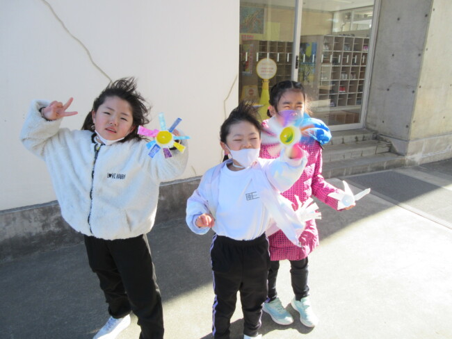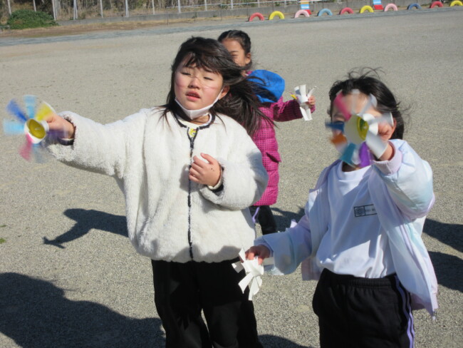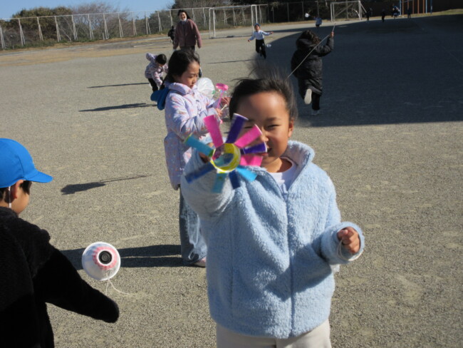 のんのん英育園に出かけた次の日は、冬らしい風が吹き、1年生は作った凧や風車などで遊びました。