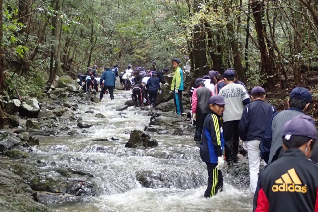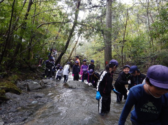 観音山最終日は、沢登りに挑戦しました。出発する前に「がんばるぞー オー」の大きなかけ声を掛け、気合いを入れました。朝までの雨で川が若干増水していたので、短いコースになりましたが、子どもたちは笑顔いっぱいで沢登りを楽しみました。昼食は「おわカレー(お別れ)」をおなかいっぱい食べ、お別れの集いの後、観音山を後にしました。とってもがんばった3日間、保護者の方はたくさんのお土産話を聞いていただけましたか?ホームページの写真をもとにさらに盛り上がってくれるとうれしいです。