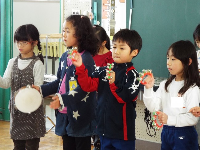 23日(木)の5時間目、1年生の参観会が音楽室で行われました。まずはグループに分かれての合奏です。