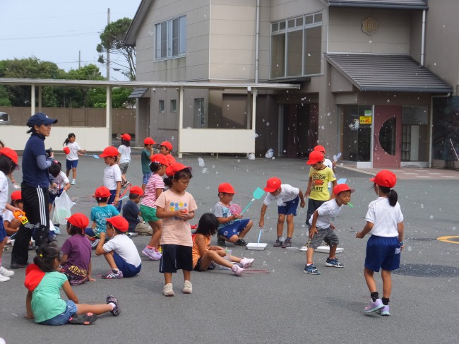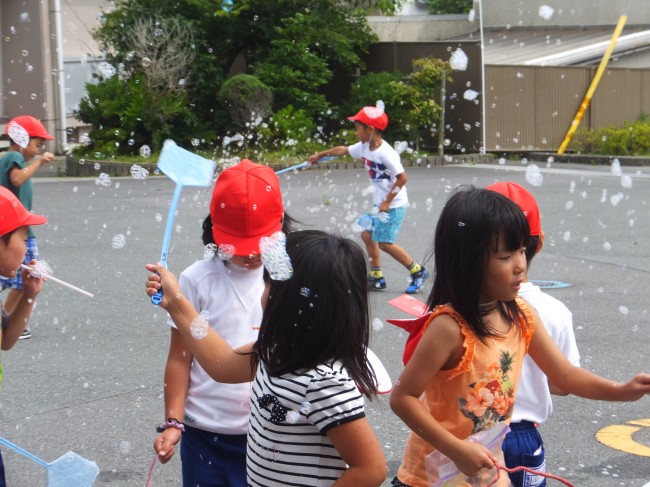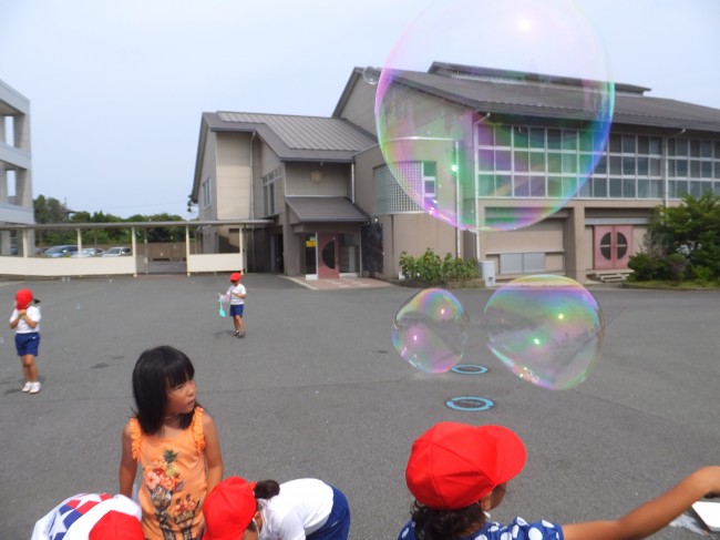 1年生(シャボン玉飛ばし) 2014/07/24 5時間目、1年生は生活科でシャボン玉を作って飛ばしました。家からハンガーやはえたたき等を持ってきて思いおもいに飛ばしていました。上手く作ることができました。