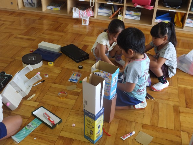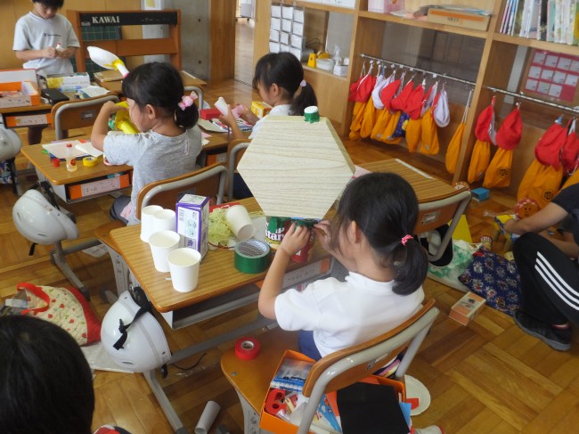 1年生(図工) 2014/09/11 1年生が段ボール箱やペットボトルを利用して、動物を作っていました。ライオンやキリン、シマウマなど工夫がいっぱいです。どの子も夢中になって取り組んでいました。参観会の時、できあがった作品を見てもらえるとうれしいです。