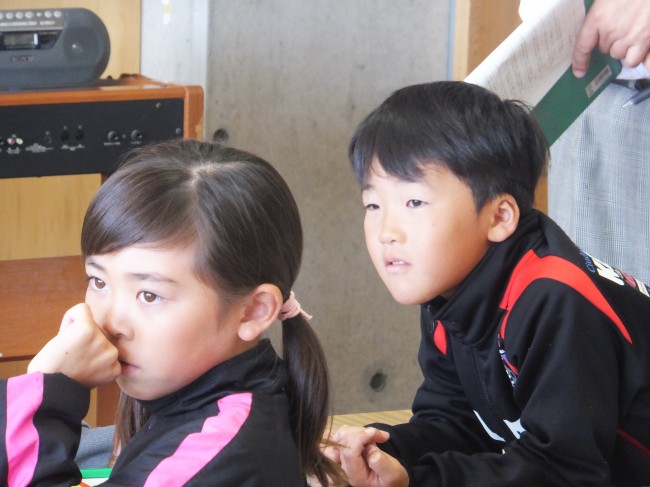2時間目(3年1組) 2014/10/24 3年1組は、算数の授業で三角形の仲間分けについて学習していました。昨日までに自分たちで作った三角形を3つの種類に分けていましたが、どうも分け方がはっきりしません。そこで、誰が分けても同じ分け方ができる方法はないか、班で相談を開始しました。班での話し合いや発表を聴く姿もしっかりしていて、学級の高まりを感じました。