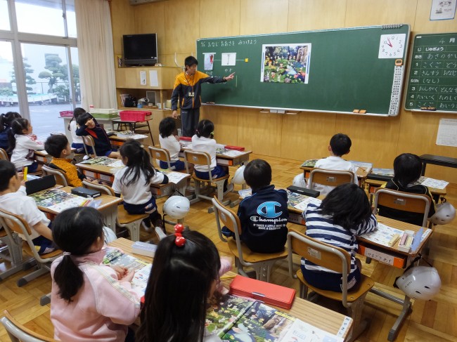 1年生は、算数で「おなじおおさをみつけよう」という課題に取り組んでいました。黒板と教科書で同じ数を見つけて発表していました。