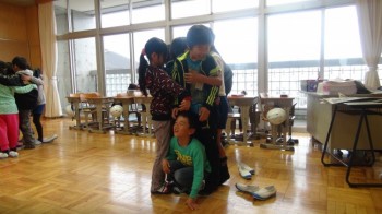 今日(7日)の1時間目、3年1組のそばを通ると、子どもたちの楽しそうな声が響いてきました。思わず教室に入りたくなりました。  教室に入ると、「人間関係づくりプログラム」の「くっついて くっついて」というエクササイズを行っていました。新聞紙の上にグループ全員が乗って、10秒間誰もはみ出さず乗っていられればクリアです。クリアすると、新聞紙を半分にしてチャレンジします。子どもたちは、どうすれば小さな新聞紙に全員乗れるか工夫していました。