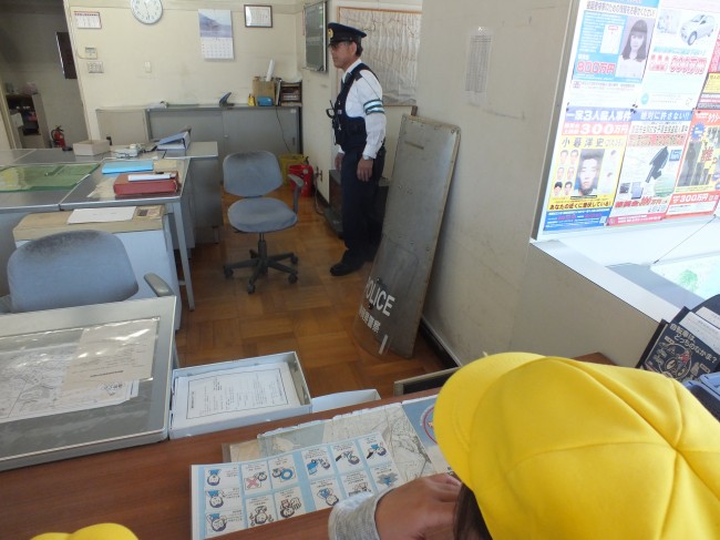 4年1組交番見学④ 2015/05/18 次は、交番の中を見せていただきました。大きなたてと、小さめで透明なたてや長い棒を見せてもらったり持たせてもらったりしました。その後警察の方から、交番に来ても誰もいない時はこの電話を使ってほしいという説明がありました。 そして最後に記念写真を撮ってお礼を言って戻ってきました。