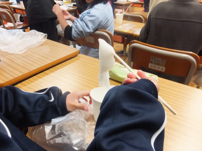 3年生は4時間目の理科で「スライムづくり」です。こねてこねて伸びを出し、感触を楽しんでいました。