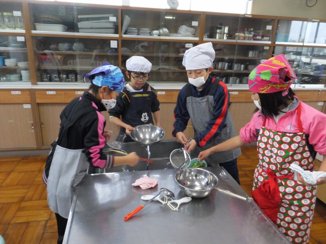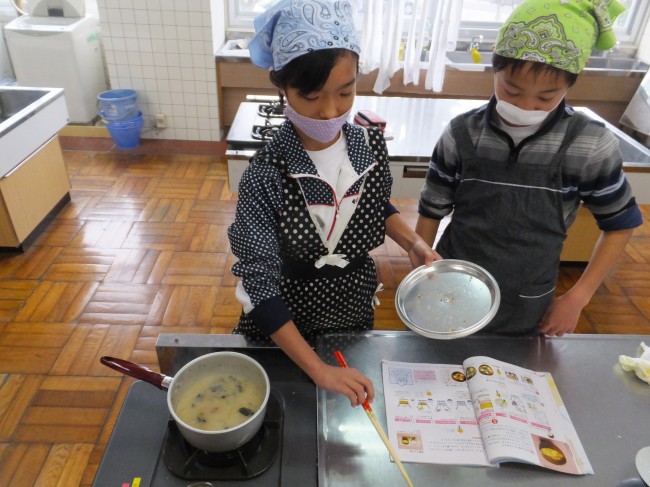 5年2組(家庭科) 2014/12/16 2時間目、5年2組が調理実習で、ご飯とお味噌汁を作っていました。どの班も自分たちが考えたお味噌汁に自信満々で、早くいただきたくてしょうがないようでした。家でもきっと上手に作れますよ。お試しあれ!