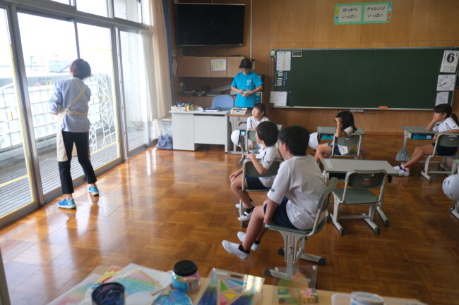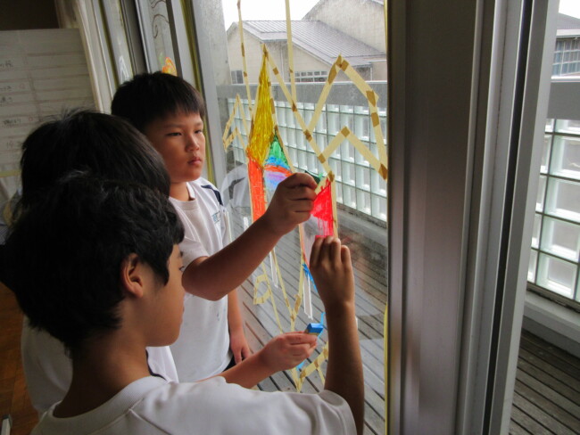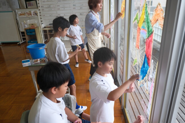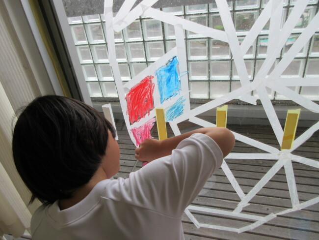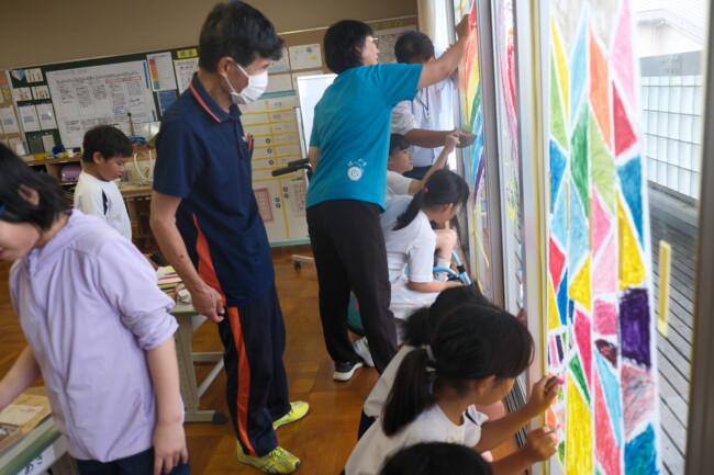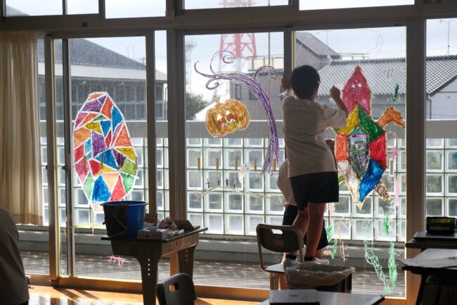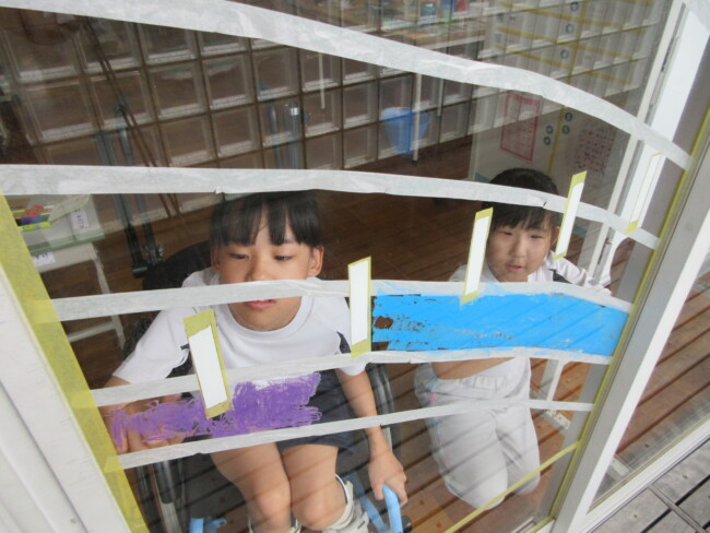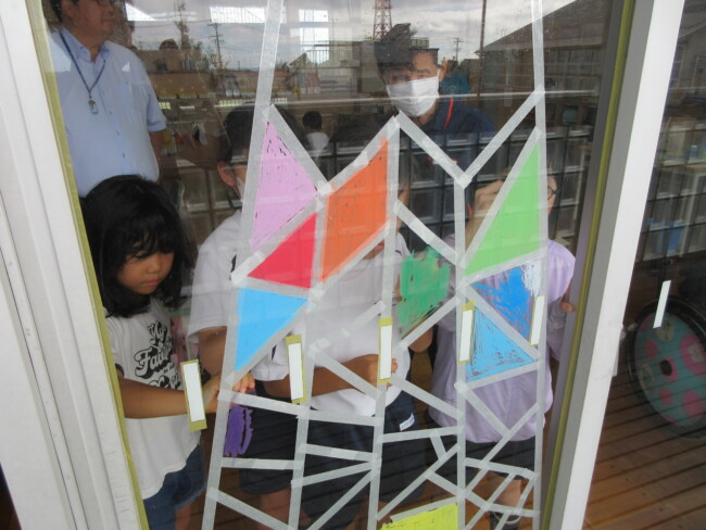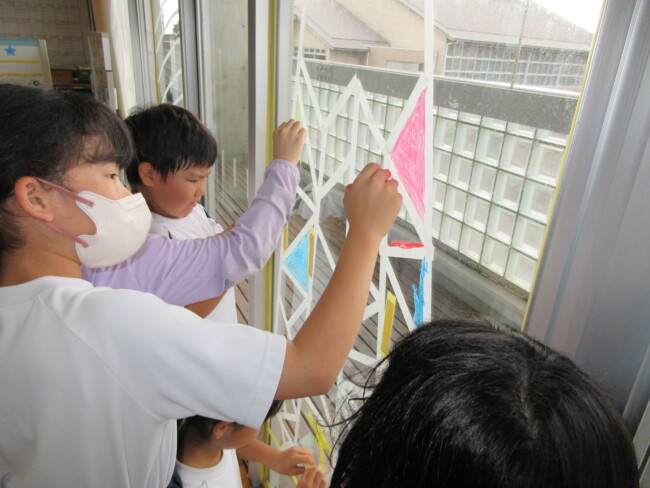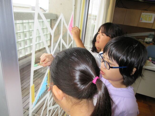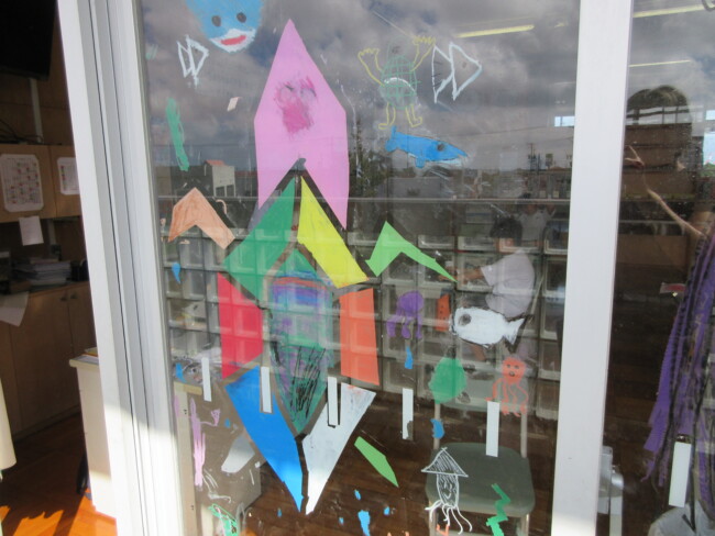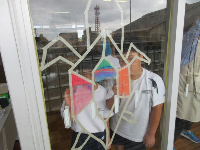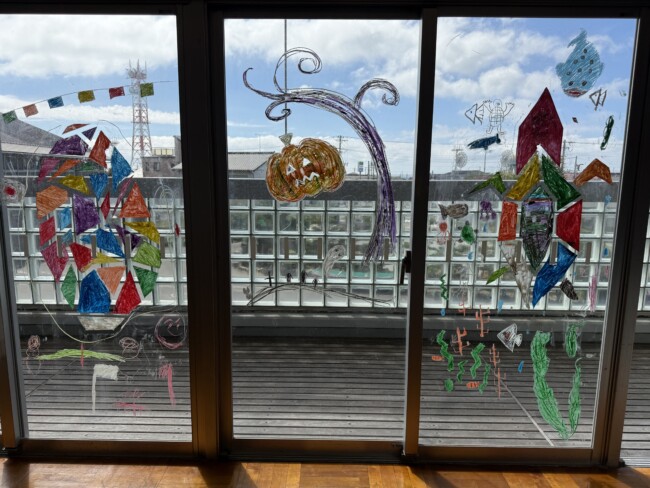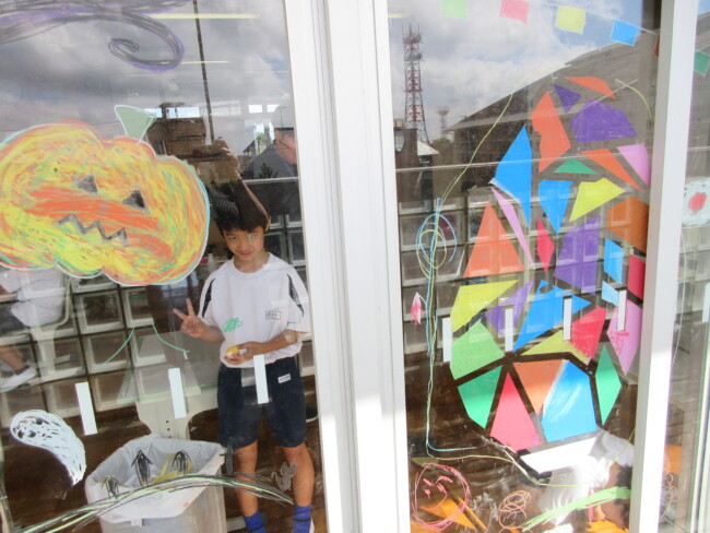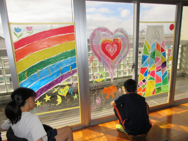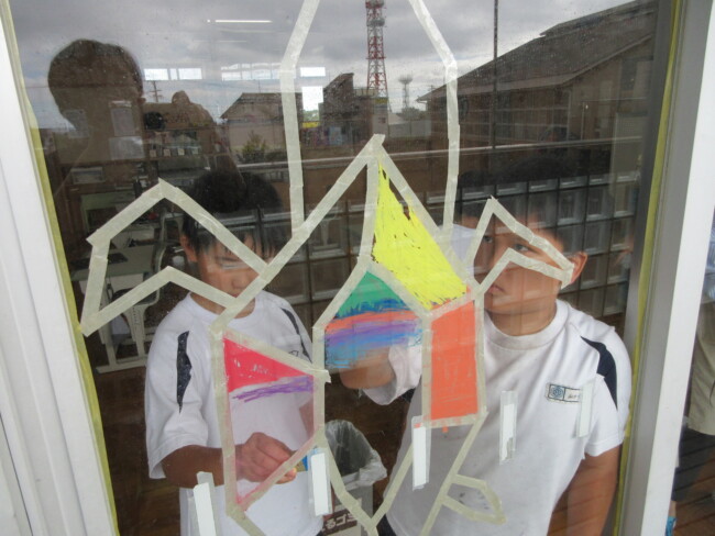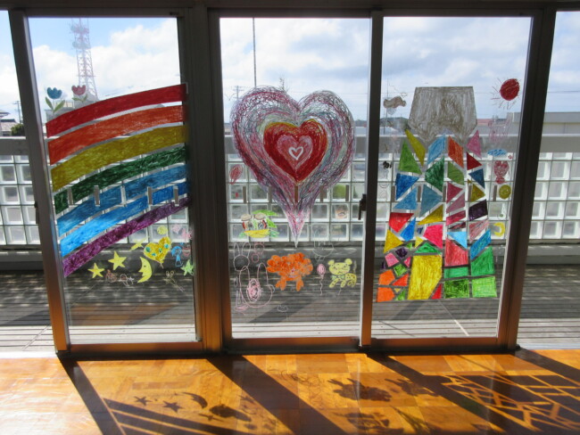 はまゆう学級では、藤枝市にお住いの田嶋さんをお招きして、「窓アート」を体験しました。窓にクレヨンで絵を描くことなど、あまり経験のないことで、はじめはドキドキしていた子供たちですが、すぐにぐいぐいクレヨンを走らせ、素敵な窓アートを完成させました。