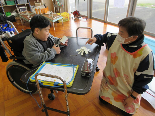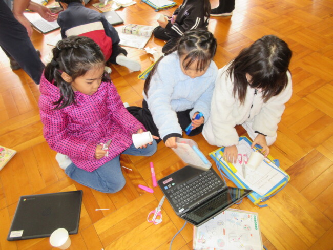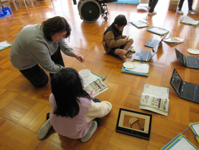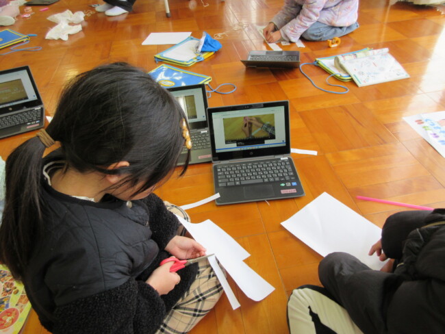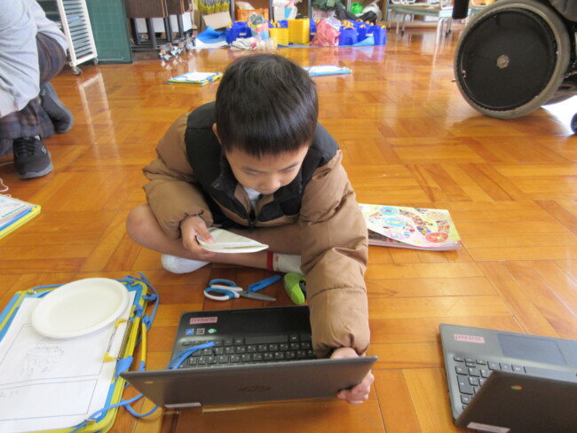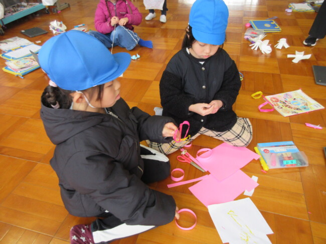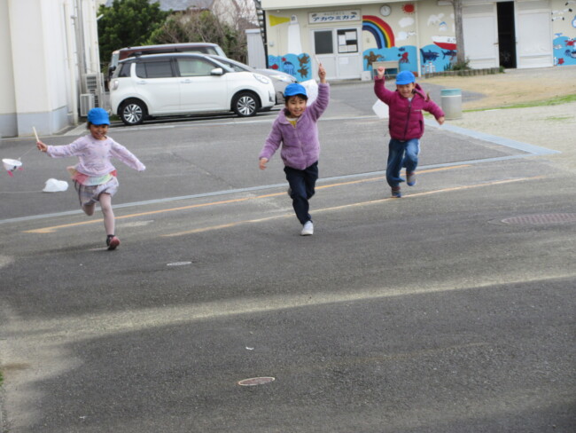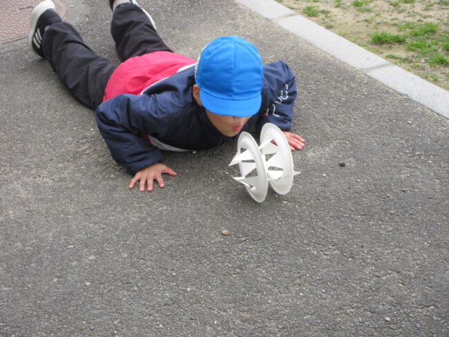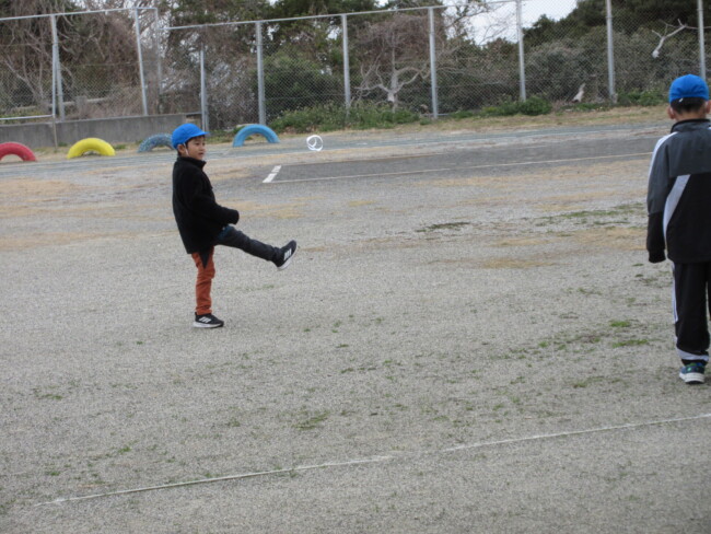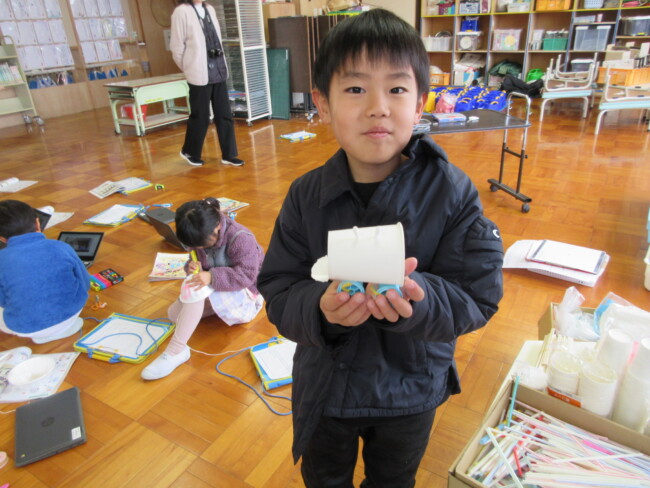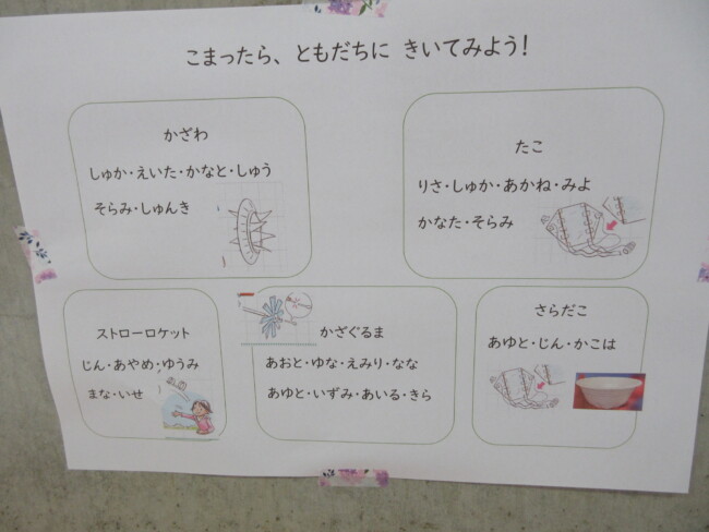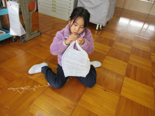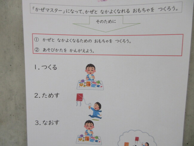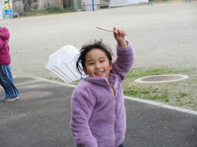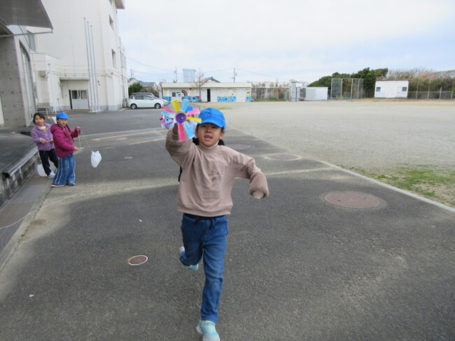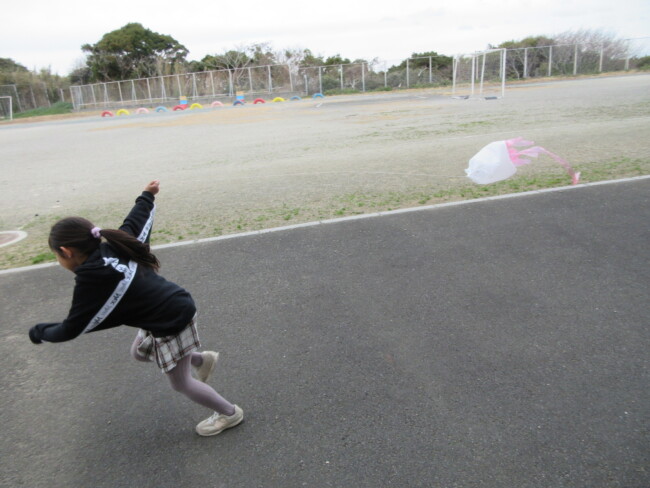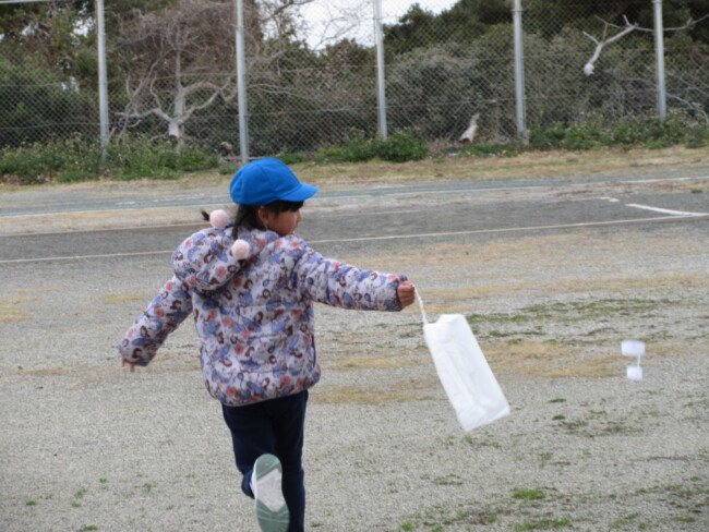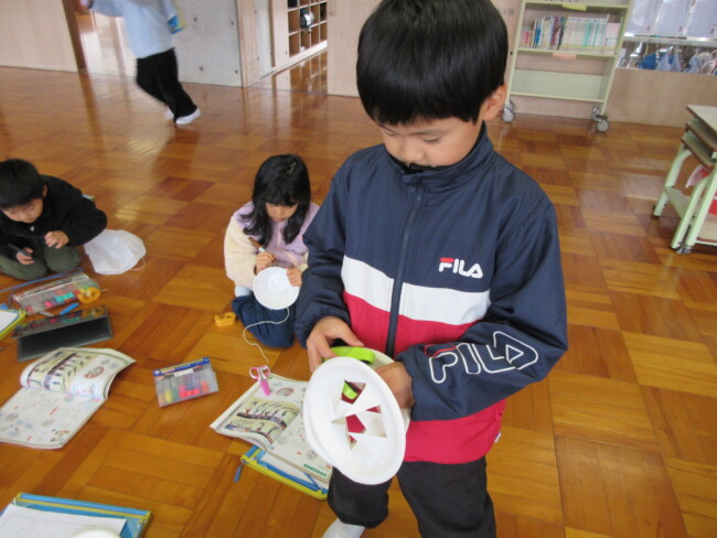 1年生が生活科の授業で、風となかよくなれるおもちゃづくりをしました。子供たちは思い思いのおもちゃを作り始め、出来上がったおもちゃを持って、さっそく外で遊んでいました。あいにく風はあまり強くはなかったですが、風向きを考えて凧あげをしている子供や、色とりどりの風車を作って回している子供がいました。冬でも寒さに負けず、走り回って風となかよく過ごしていました。