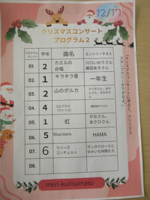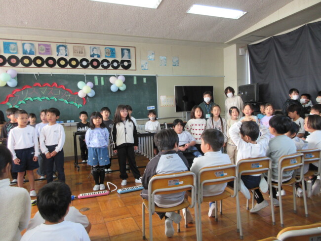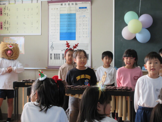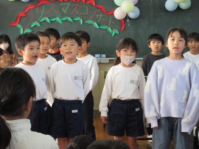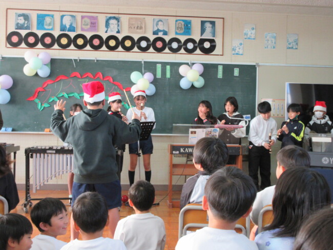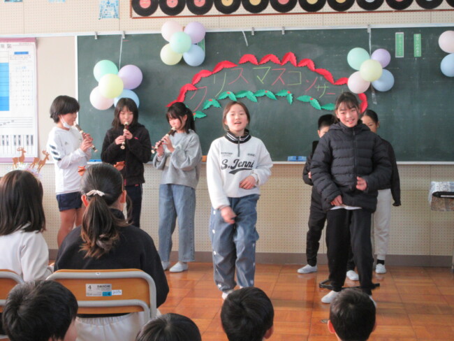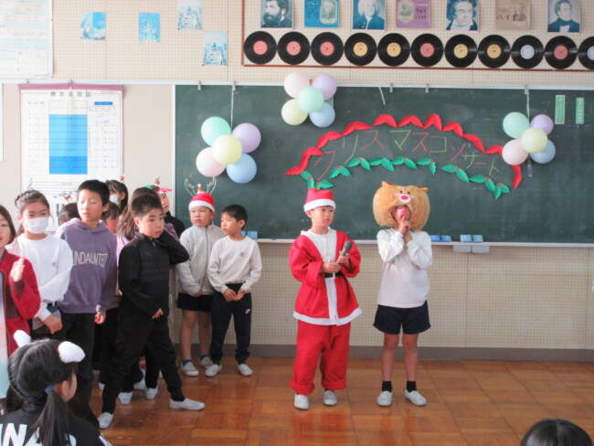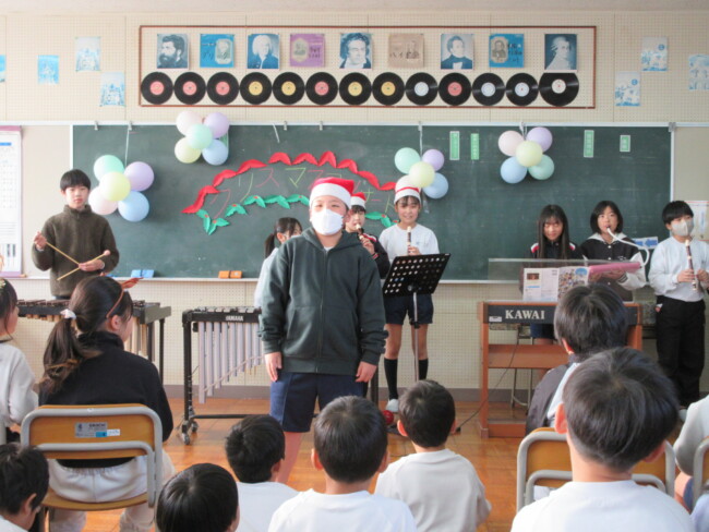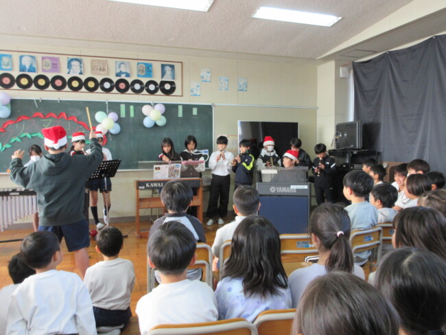 クリスマスコンサートpart2 2025/12/17 本日はクリスマスコンサートの二日目です。音楽室は出演者と観客で大賑わいでした。4年生の上手な司会で、出演者も観客も一体となってクリスマスコンサートを盛り上げていました。いよいよ明日はファイナルです!