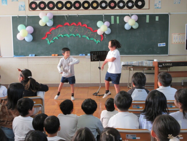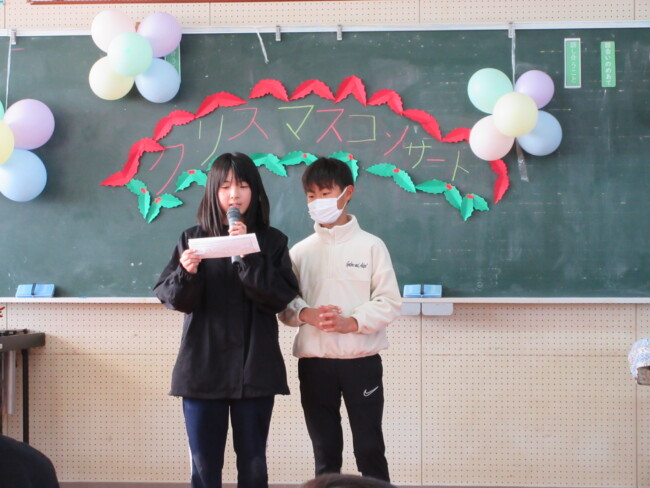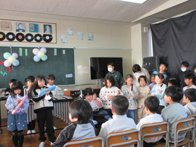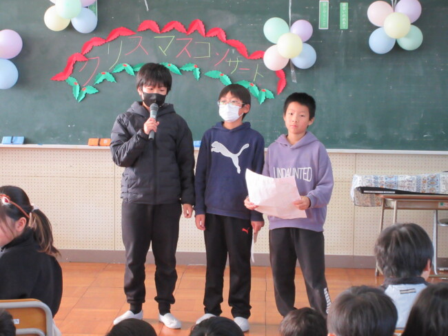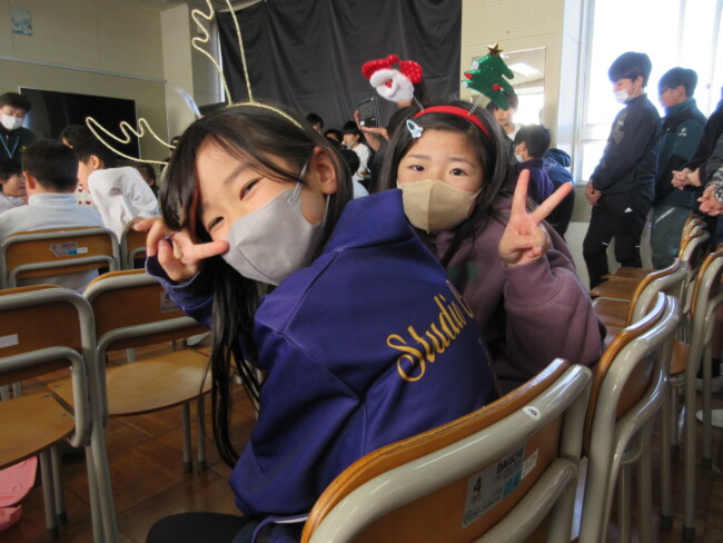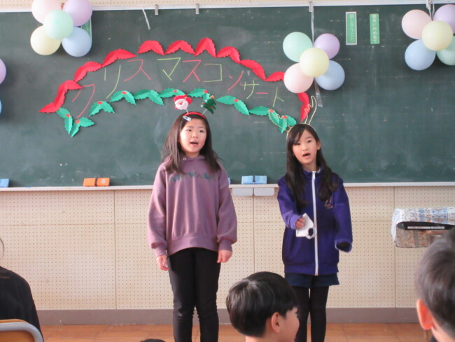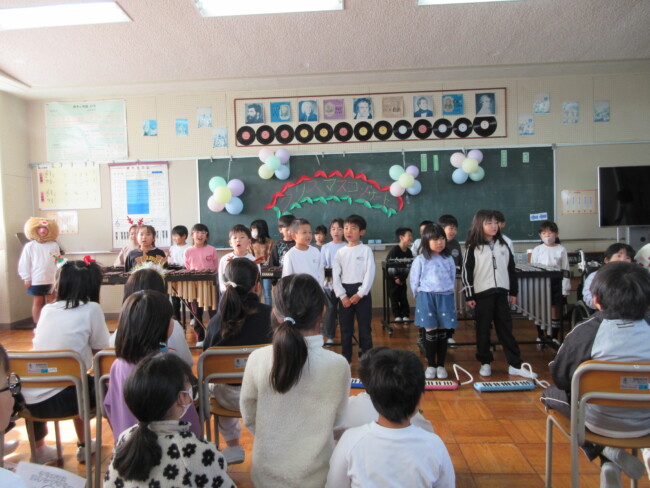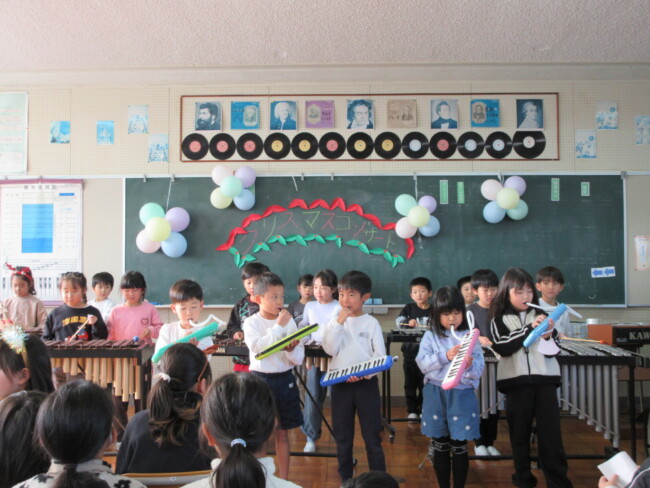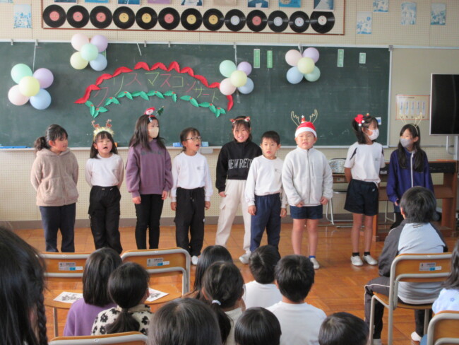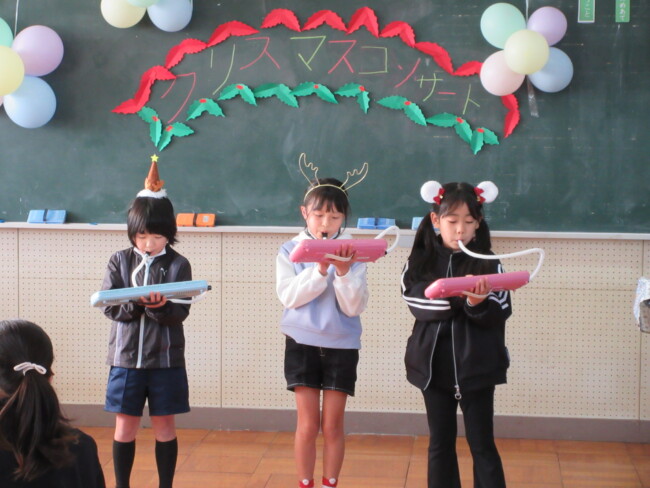 クリスマスコンサートpart2 2025/12/17 本日はクリスマスコンサートの二日目です。音楽室は出演者と観客で大賑わいでした。4年生の上手な司会で、出演者も観客も一体となってクリスマスコンサートを盛り上げていました。いよいよ明日はファイナルです!