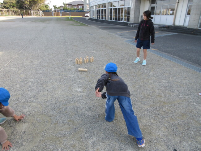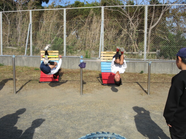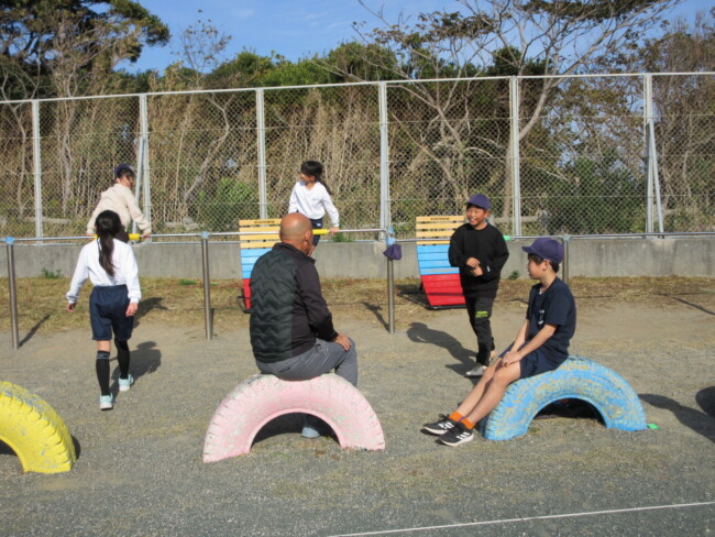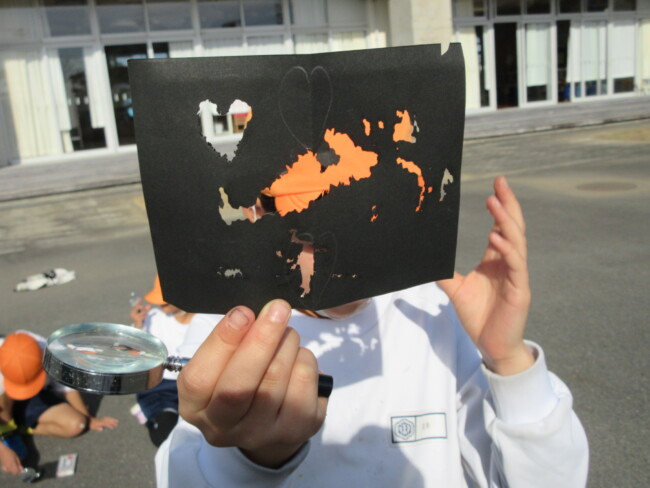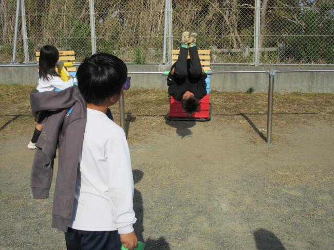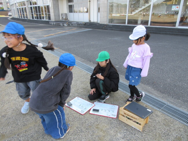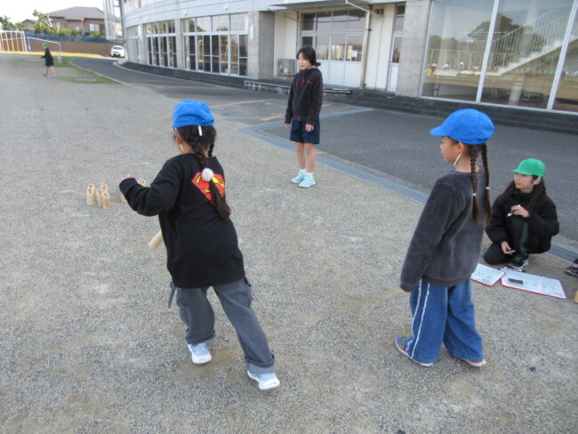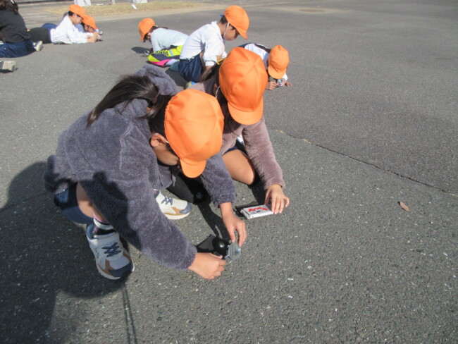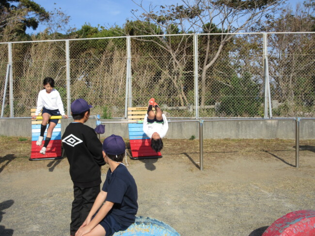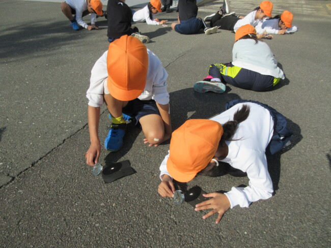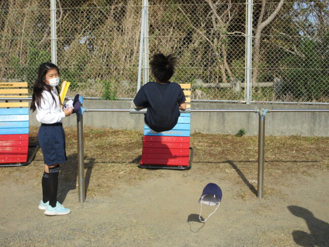 本日はぽかぽか陽気で、運動場でもいろいろな学年の子供たちが遊んでいました。3年生は、理科で学習した「光を集めて熱を発生させる」実験をしていました。健康委員会主催のスポーツも行われていて、1年生が楽しんでいました。4年生は鉄棒をやっていて、ずいぶん上達していました。
