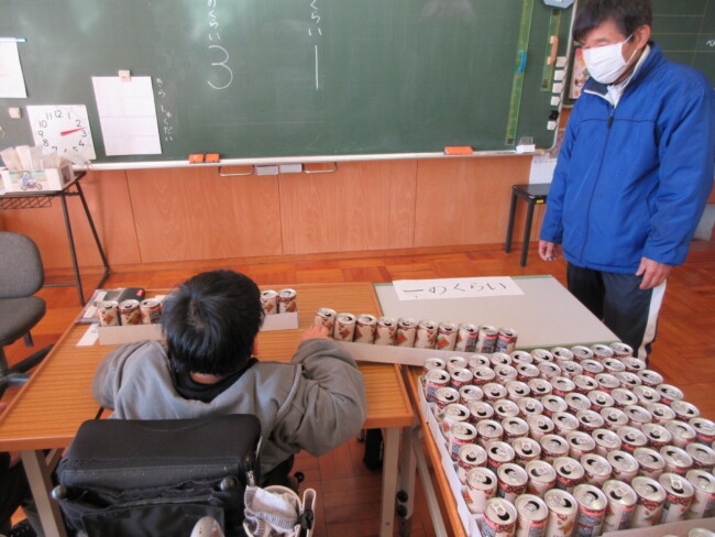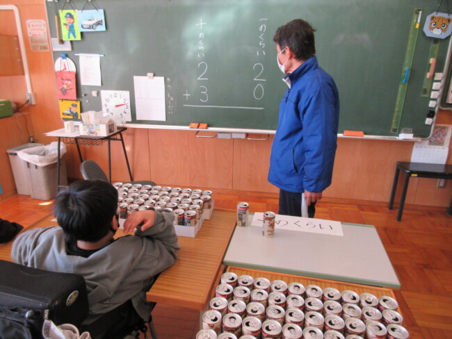 はまゆう3組では、アルミ缶で10のかたまりをつくって、二桁の足し算をしていました。