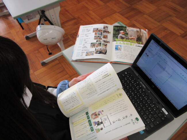 6年1組は、国語の勉強で、自分が関心のある仕事について調べ、スピーチ原稿を作っていました。