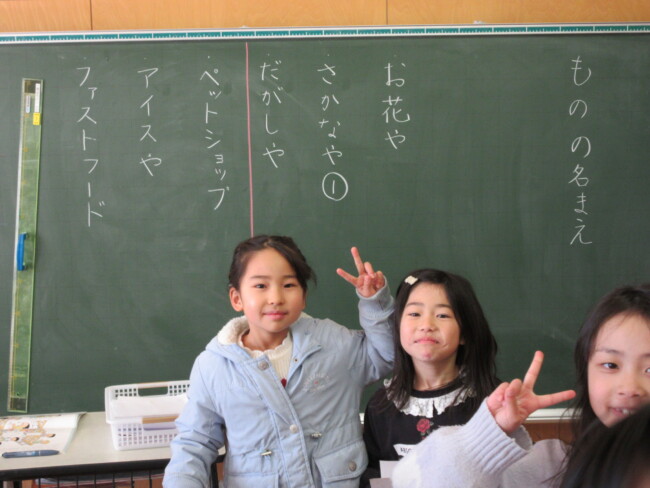 1年生国語「ものの名まえ」 だがしやさんだったり、ペットショップやさん、ファストフードなど、いろいろなお店で、いろいろなものの名前のものが売られていました。