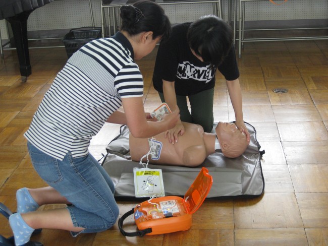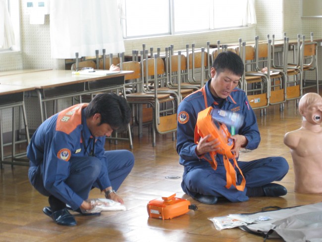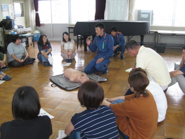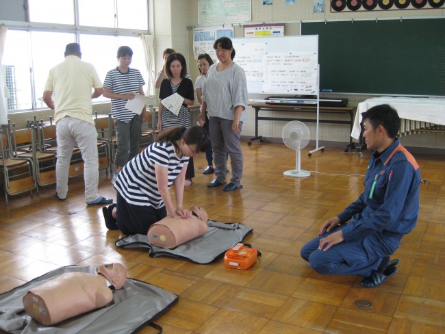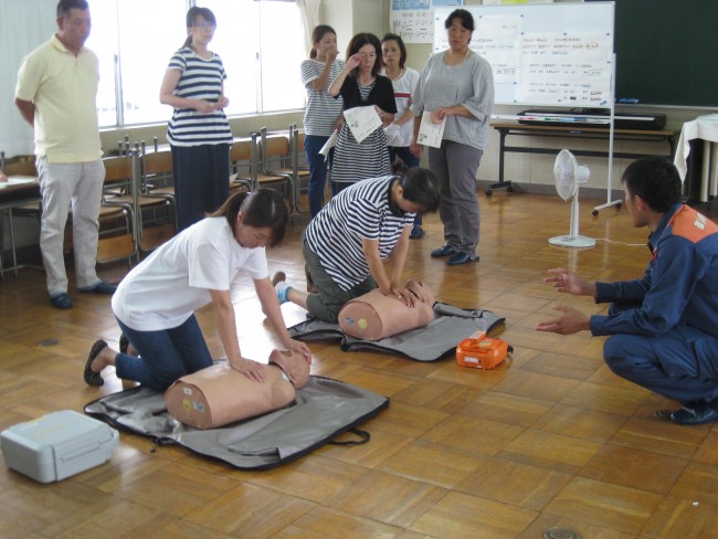 救急救命講習(保護者) 2018/07/17 7月12日(木)にPTA救急救命講習がありました。夏休みプール開放に向けての講習です。もしもの時に、正しい救命方法を知っているのはとても大切なことです。今回は、御前崎市消防本部の方を講師に、心臓マッサージ、AEDの使い方などを学びました。暑い中、参加してくださった保護者の皆様、ありがとうございました。夏休みのプール開放への御協力もよろしくお願いいたします。