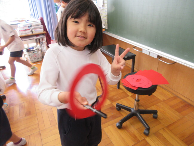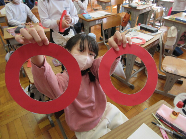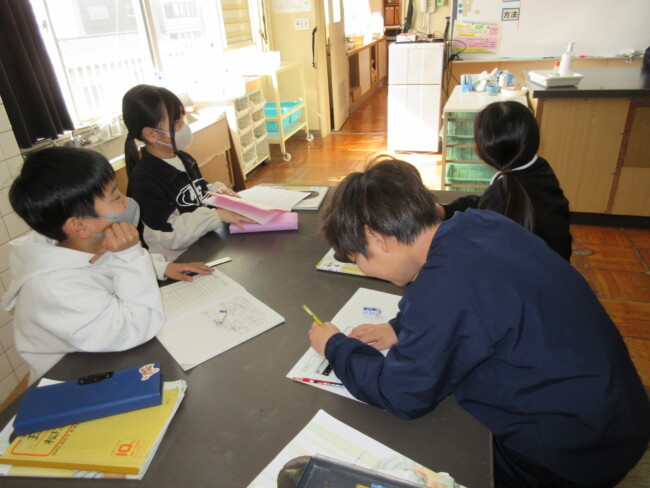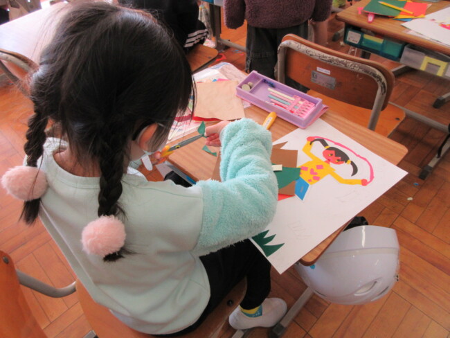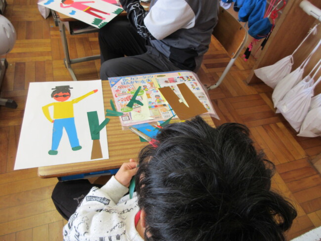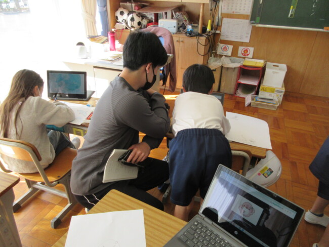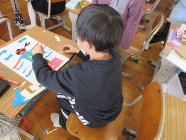1年生の図工の様子。実習生の大須賀先生もお手伝いしてくれました。