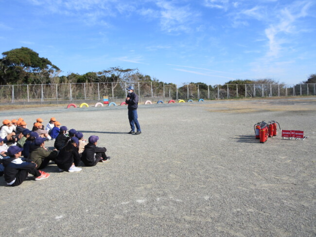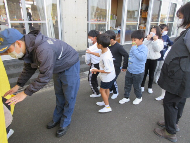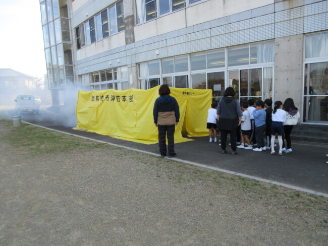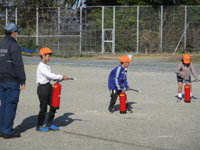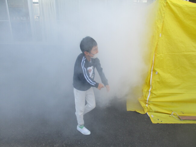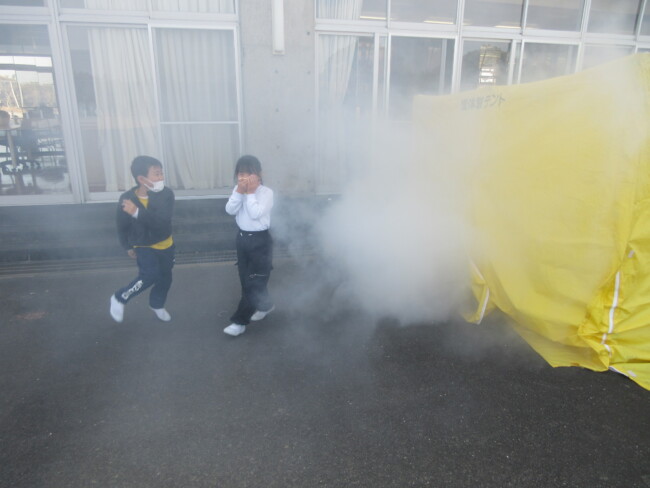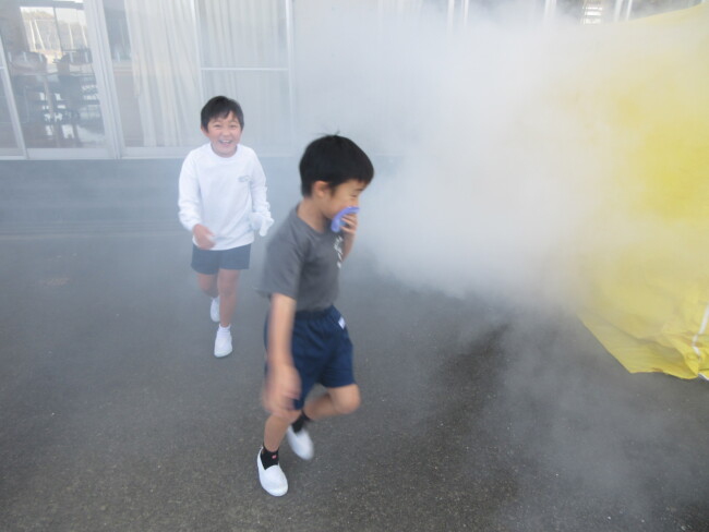 防災教室で、煙・消火器体験をしました 2025/12/11 1~4年生が、3時間目に防災教室を行いました。1~2年生は煙体験を、3~4年生は消火器体験をしました。「煙は実際には黒く前がもっと見えないんだよ」というお話を聞いたり、「火遊びが大きな火事になるときがあるので、絶対にしない」というお話を聞いたりして、防災意識を高めていました。