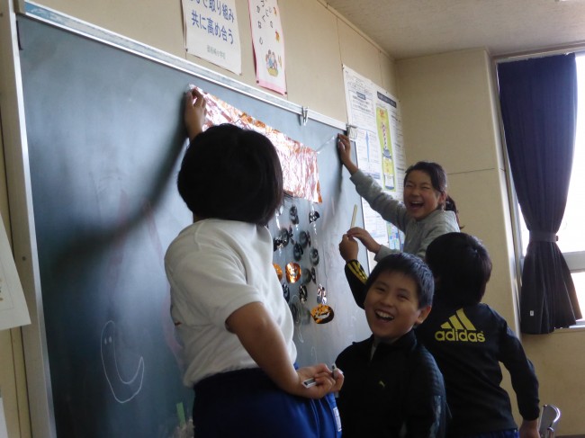 11月11日(金)の昼休み、4年1組で少し遅れたハロウィンパーティー(お化け屋敷)が行われ、たくさんのお客さんが来ました。会議室の中で問題を3題出題し、それに答えられないと、部屋から出してもらえないようです。