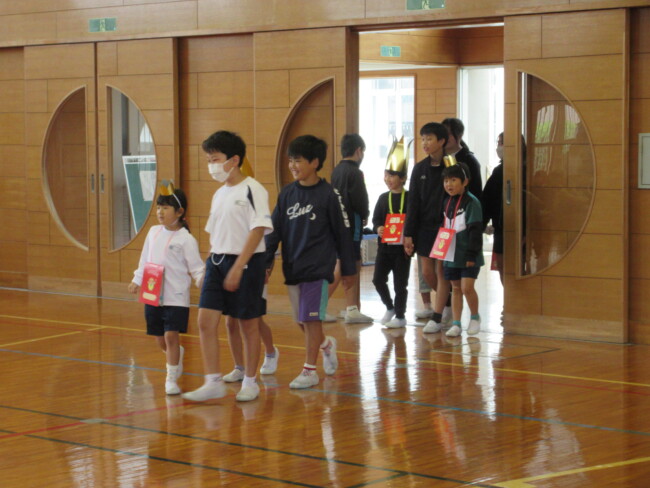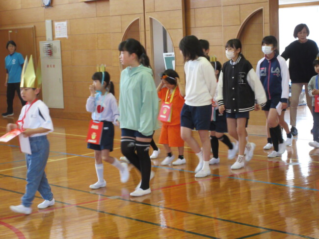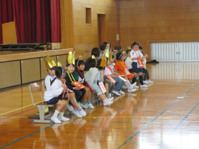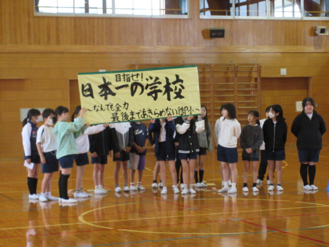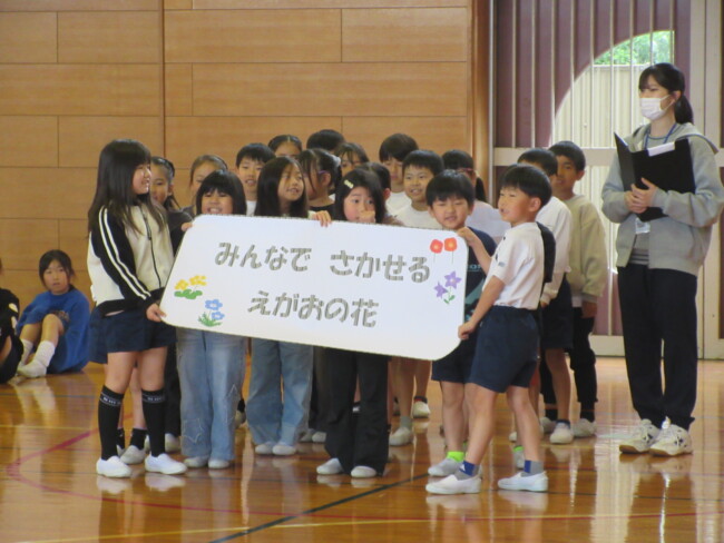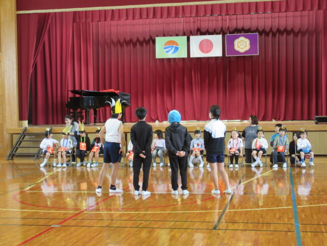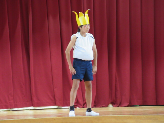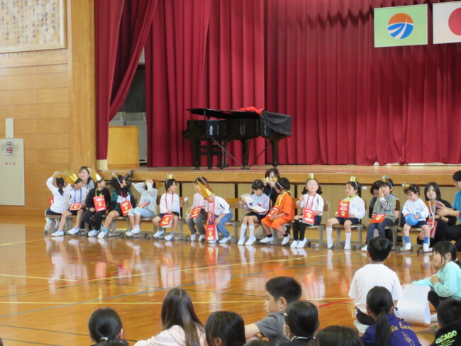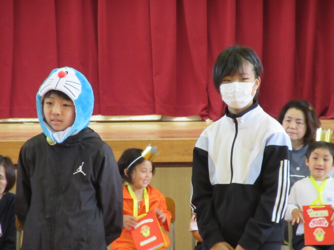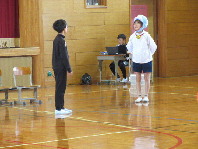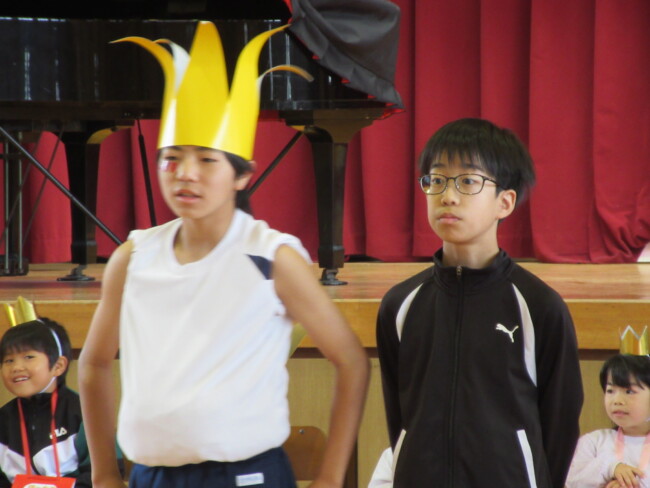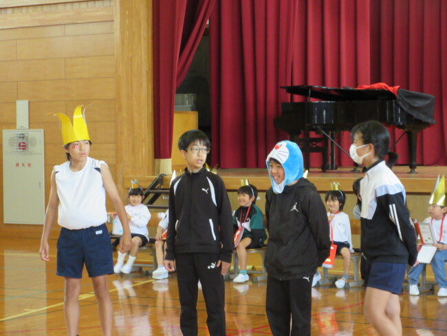 六年生が中心となりこの会を運営してくれました。今年は六年生の発案で、「司会者進行型」から「アニメ劇型」に変更して、ジャイアン、のび太、ドラえもんとゆかいな仲間たちが会を進行し、学級目標の発表や委員会の紹介などを行いました。時間のない中での準備でしたが、六年生が主体的に動いてくれたので、御小が一つになった時間でした。六年パイセンありがとう。次回もよろしく。