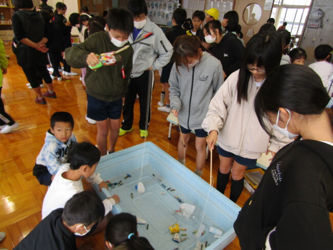 2年生が、全校の子供たちを対象に「おもちゃランド」を開きました。150周年記念の日に、保護者や地域の方々に遊んでもらった「おもちゃランド」です。